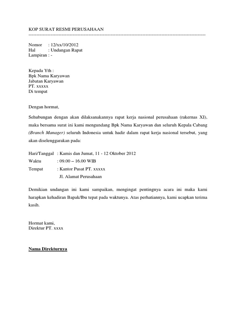Surat undangan resmi pelatihan ini dituliskan dalam bentuk surat formal dari perusahaan tempat pegawai tersebut bekerja. Pimpinan daerah ikatan mahasiswa nahdlatul ulama contoh surat undangan rapat perusahaan. 8 contoh surat undangan menghadiri acara isra miraj. Contoh surat undangan rapat dinas. Seperti yang sudah kita ketahui, sebuah perusahaan sudah bisa dipastikan mempunyai agenda dan untuk kepentingan perusahaan, memang sangat membutuhkan surat undangan yang bersifat resmi. Contoh surat undangan rapat perusahaan. Bisa digunakan untuk mengundang peserta rapat internal suatu lembaga atau perusahaan. Contoh surat undangan rapat sekolah. Surat undangan untuk keperluan rapat tentulah ini merupakan suatu surat formal yang mana inti dari surat tersebut ialah mengundang suatu individu maupun kelompok untuk berdiskusi entah itu menyelesaikan masalah dan lain sebagainya atau jika dalam bahasa jawa ngrembokne suatu. Surat undangan resmi merupakan surat undangan yang dibuat oleh suatu perusahaan, instansi atau organisasi dengan format yang resmi. Adapun contoh dari surat resmi adalah surat lamaran kerja, surat pengunduran diri, surat penawaran dan yang lainnya. Contoh surat undangan rapat perusahaan. Disini surat undangan resmi merupakan surat undangan yang dikeluarkan oleh pihak organisasi yang biasanya ditunjukan kepada organisasi lain atau perseorangan.